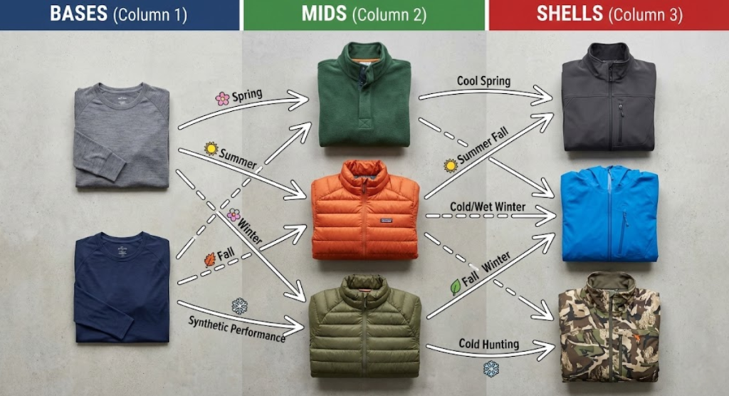 Pro Tip: Think of layers as knobs you can turn separately: moisture (base), warmth (mid), and exposure (shell). That’s far more controllable than “one jacket that does everything badly.”