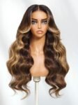 UNice 13×4 Pre-Everything Lace Frontal Brown with Honey Blonde Highlights Loose Wave Drawstring Wig with Face Framing Layers